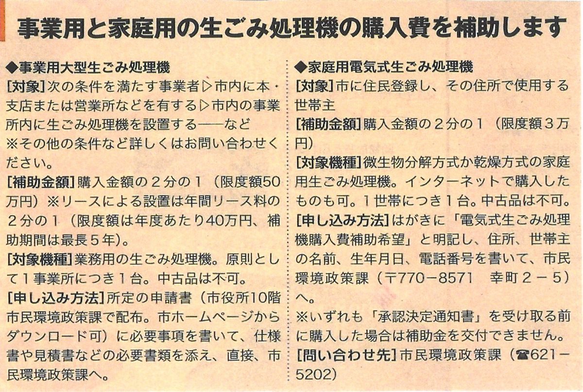 徳島新聞に生ごみ処理機の購入費を補助するという記事が掲載されていました。