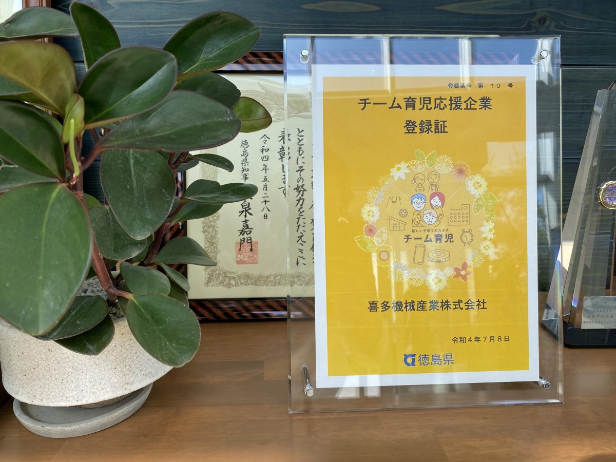 この度喜多機械産業は徳島県のチーム育児 応援企業に登録しました!