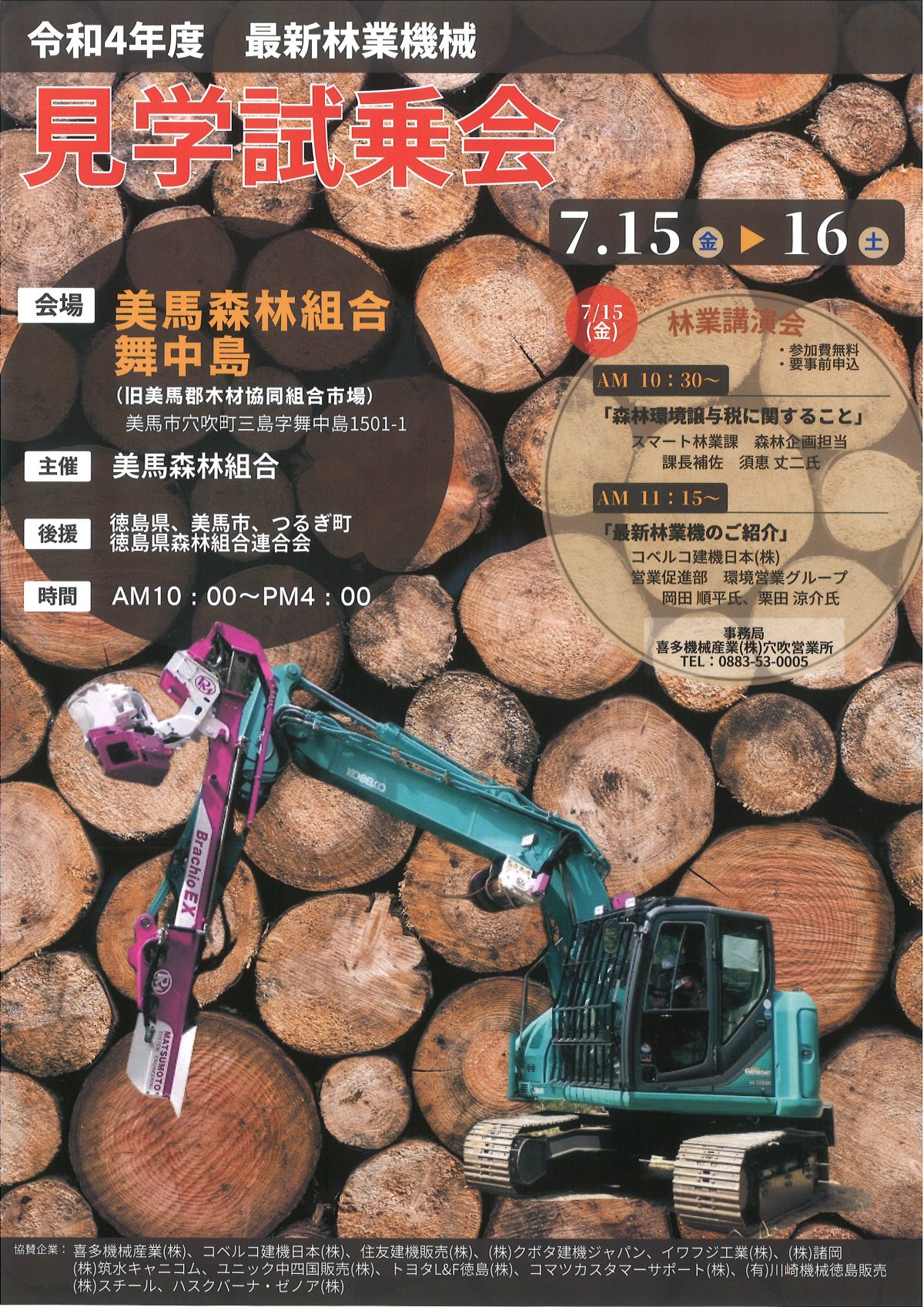 美馬森林組合主催の令和4年度最新林業機械見学試乗会が7/15~16に開催されます!🌲