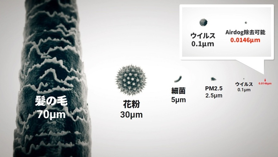 【試験空間】30㎥【試験方法】Airdog稼働時の除去効率と自然減衰率を比較【試験結果】0.0146μmの粒子を(X3s:30分/X5s:42分/X8Pro:22分)で99.9%以上除去