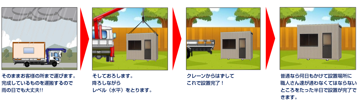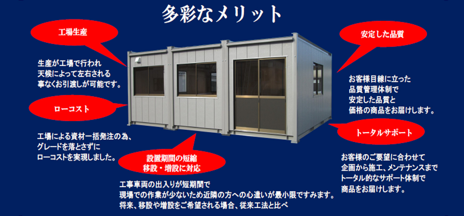 このため、プレハブや従来工法と比べ工期が短く、移設や増設に柔軟に対応でき、施工時の廃棄物が少なく環境にやさしい商品です。