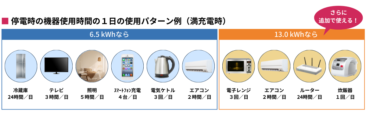 停電時は、蓄電池から電力供給を行い、テレビや照明など接続した機器を一定時間使用することができます。太陽光発電システムと併用している場合は、発電しながら余剰分を蓄電するため、より長く電力を使用でき、停電でも安心の備えとなります。