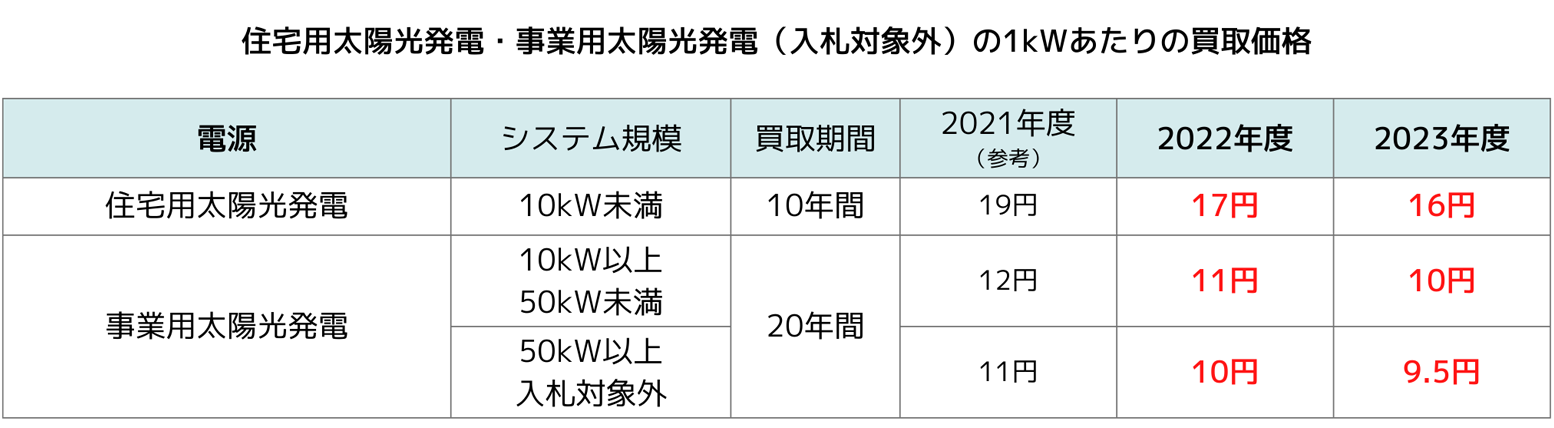 固定価格買取制度(FIT)での買取価格・期間は住宅用 10kW未満)、産業用(10kW以上)で異なり、ご契約年度によっても異なります。