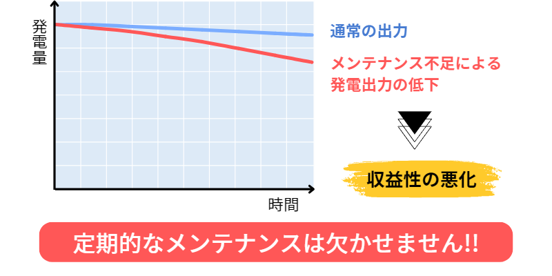 メンテナンス不足で、発電量が減るだけでなく、周辺の土地や建物に危険を及ぼし、近隣トラブルにつながる可能性もあるため、日頃のメンテナンスでいち早く、異常に気付くことが大切です。